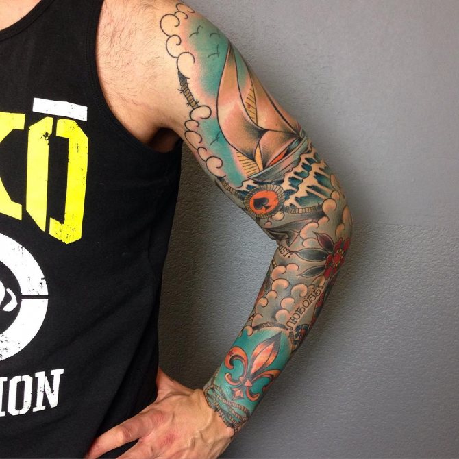 The "sleeve" tattoo is a men's body image that covers almost the entire area of the arm. Such a tattoo can be a complete picture or consist of separate parts. Also popular are tattoos on the wrist, which are never the first, but only complement the existing composition of tattoos. The most popular variant of men's tattoos on the wrist is the tattoo bracelet. Also often on the male wrist you can see the image of botanical plants, such as a rose, fern leaves or a tree.