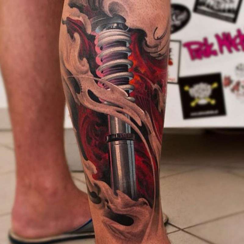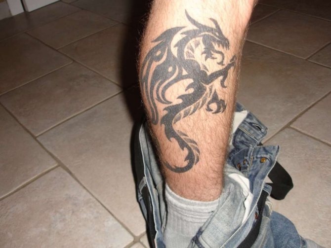 When choosing a place for a tattoo on the leg men do not choose for a long time, stopping their choice on the calves. The calves are a popular place for images, which began to be used not so long ago. Such tattoos can be applied either to one of the legs or to both at the same time. When creating a paired drawing, a single subject is used, which is divided into two legs. It is also possible to use different tattoos done in the same style. Since this part of the body is not particularly sensitive to pain, it is possible to use a large drawing, printed on the entire lower leg.