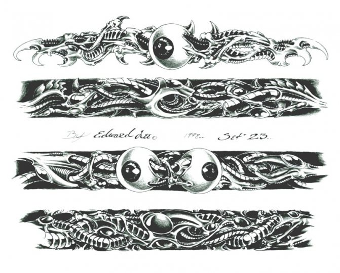 In men are more in demand brutal black and white sketches that can serve not only as an inscription, but also portraits of loved ones, favorite actors or fantastic characters (heroes of movies, comics or games). Many give preference to patterns or more complex drawings representing tattoos with Celtic motifs.