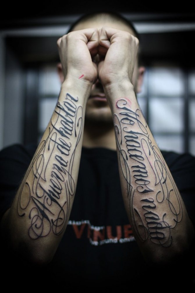 This area of the hand is very popular for a body drawing due to the fact that here the zone of minimal sensitivity to pain, and the skin area itself is completely open to prying eyes. In most cases, various inscriptions and quotations in English or Chinese are used on the forearm. The tattoo on the forearm can serve as a separate tattoo or as part of the overall composition.
