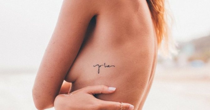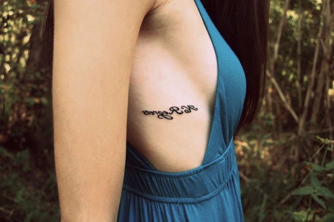 - Inscriptions are a universal option for men and girls, which can be placed not only on the rib, but also on any other part of the body.