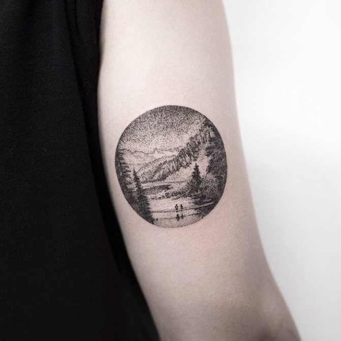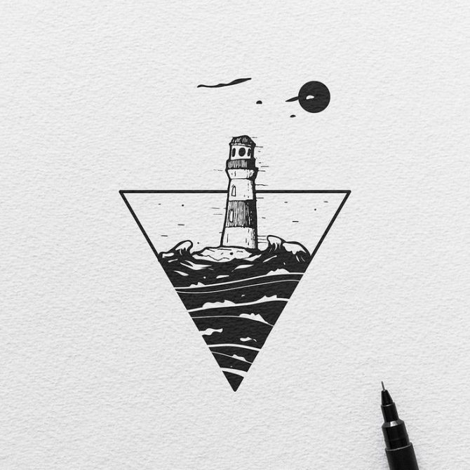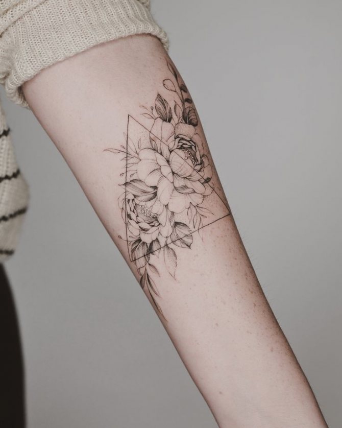 Classic tattoo in the style of minimalism is monochrome, with clear lines and a variety of geometric elements (circles, rectangles, triangles).