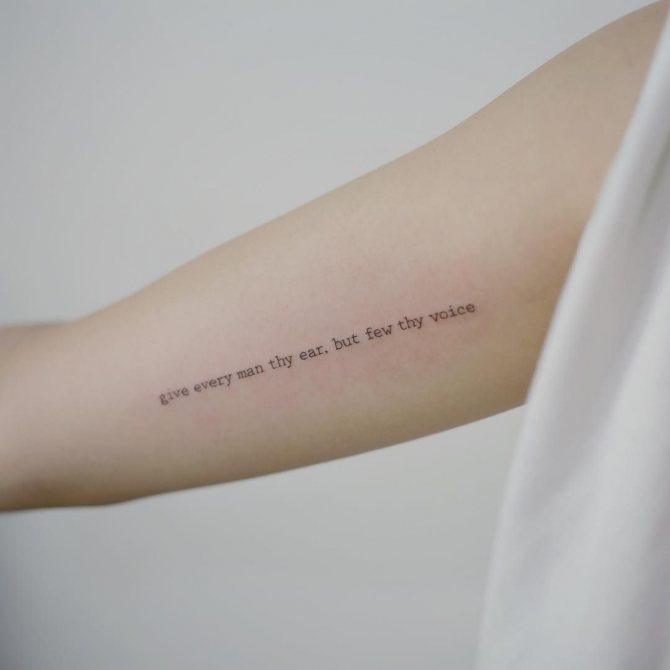 The popularity of minimalist tattoo inscriptions is gaining in recent times. Female representatives of the fair sex inscribe various sayings and aphorisms in French and English, as well as in Latin.