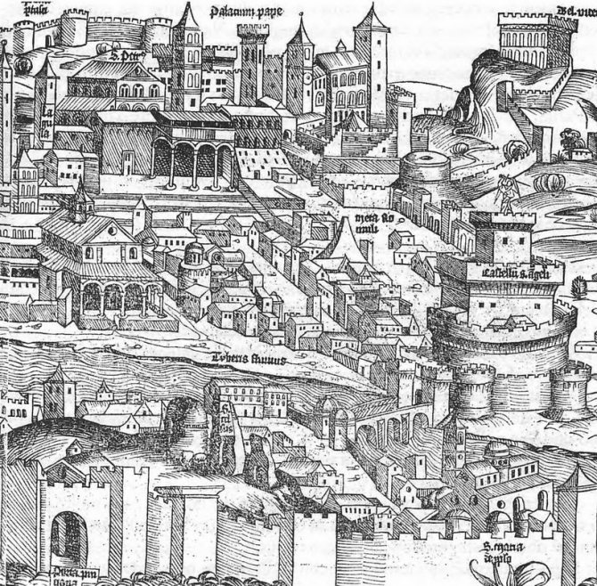 Ninth-century mosaics in the Church of St. John on Lateran Hill show Christ giving Charlemagne the scarlet banner of the empire with a golden cross on its shaft. A description of this banner is preserved in the Song of Roland.