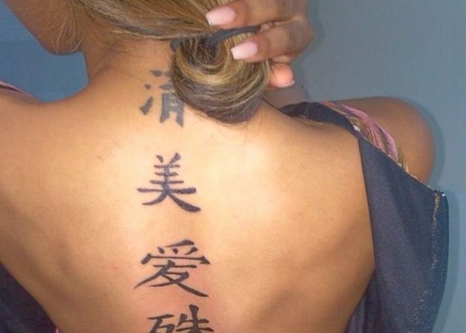 And finally, hardened lovers of personal inscriptions prefer to do tattoos on the back. Here the choice of places is very diverse: along the spine, under the neck, on the lower back. On the back, as a rule, stuffed large-scale work - statements, thematic Chinese or Japanese drawings.