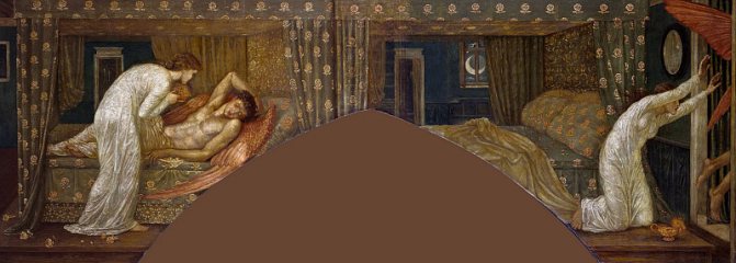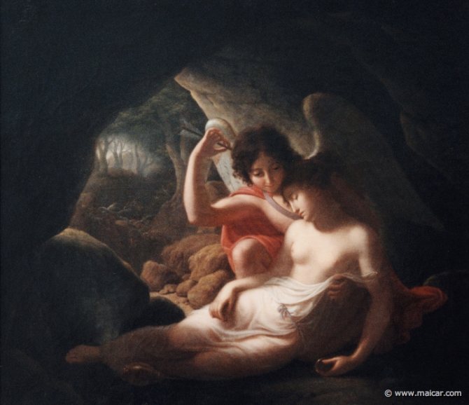 As is often the case, love often falls prey to envy. Burning with curiosity, aroused by her sisters (You don't know who he is, they said. What if he's a monster?" they said), Psyche lit a candle, and she saw the beautiful young man sleeping on their bed. Alas, a drop of wax fell on his body, and Eros awoke. With regret and sadness he said that now they would have to part. And he disappeared.
