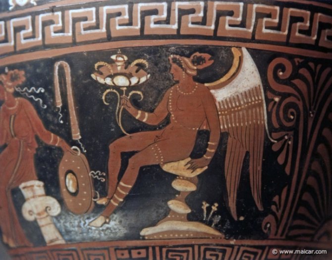 Eros is depicted on ancient vases either as a child or as a handsome and statuesque young man. His attributes are not always a bow and arrow - often the god is holding a rabbit, a flower or a belt.
