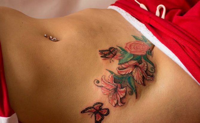 In the female version of the tattoo sketch you can find a combination of flowers and a butterfly as a symbol of cyclicity and rebirth. The combination of flowers and dagger means the murderous power of beauty and its danger. A ladybug can be placed on the flower petal, a symbol of successful marriage, youth and kindness. In the tattoo under the breast, flowers are combined with gemstones and netting, turning them into jewelry.