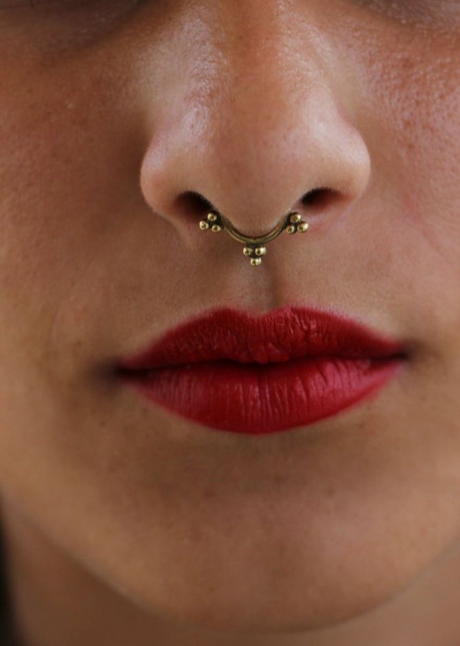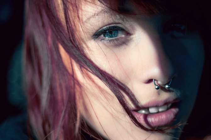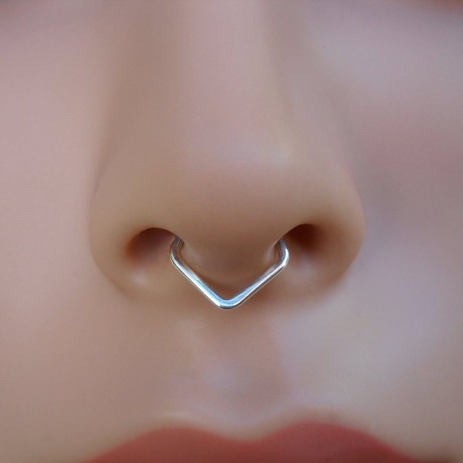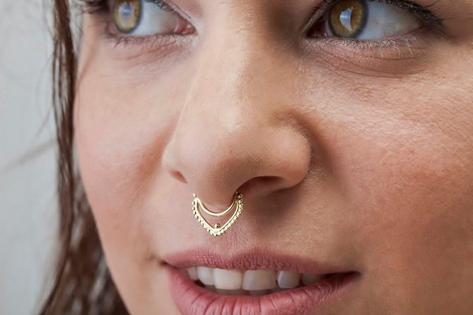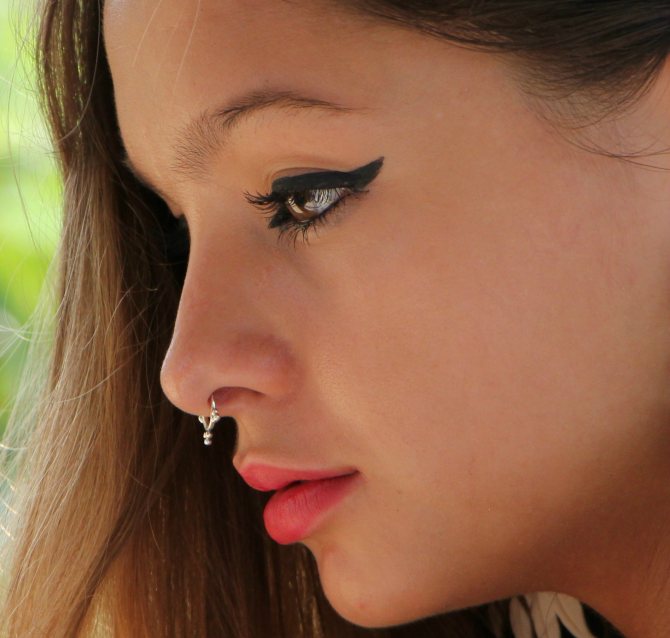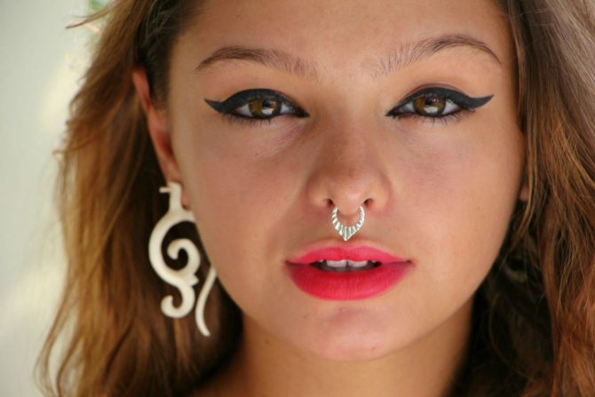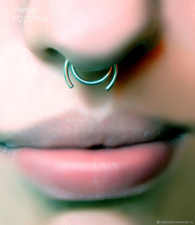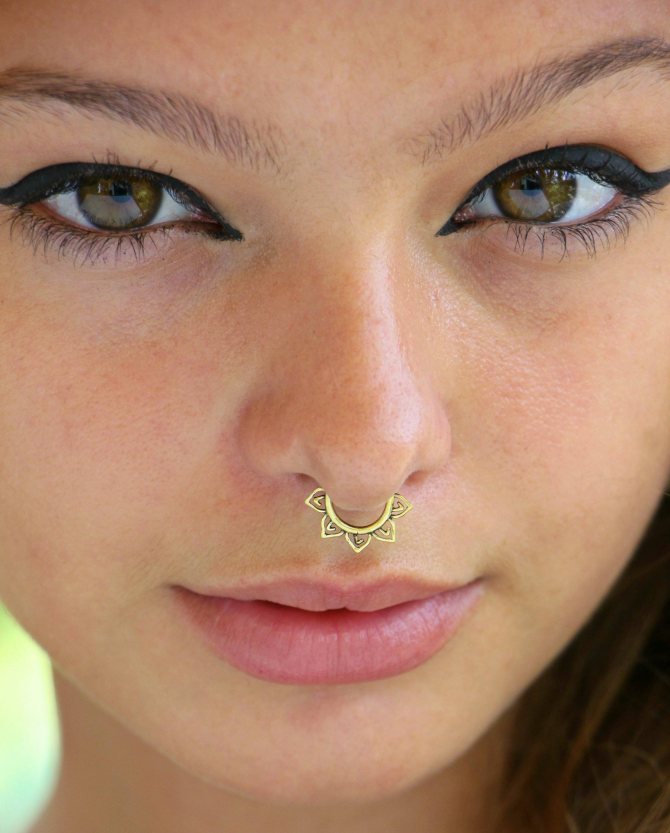 - Septum. Another popular type of nose piercing in which the central nasal septum is pierced between the nostrils, or between the cartilage and the septum. An accessory, a clicker or a crescent-shaped ring of such magnitude that it is visible from the nostrils above the upper lip, is put on the piercing site. This kind of jewelry is universal, it has many fans among both men and women. Due to the anatomical features of such a piercing is considered the most difficult, it is not always possible to make it perfectly straight from the first time. It is necessary to be prepared for the septum to require several punctures during the procedure.