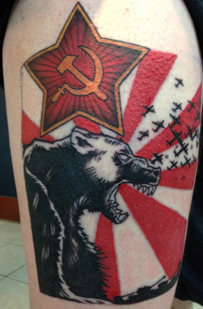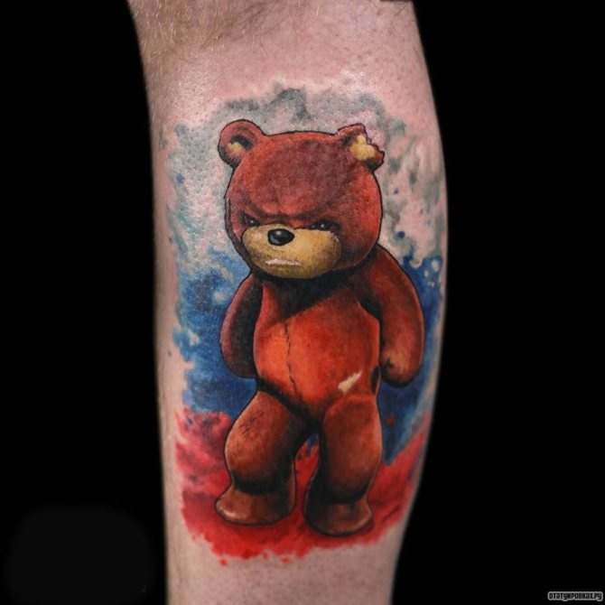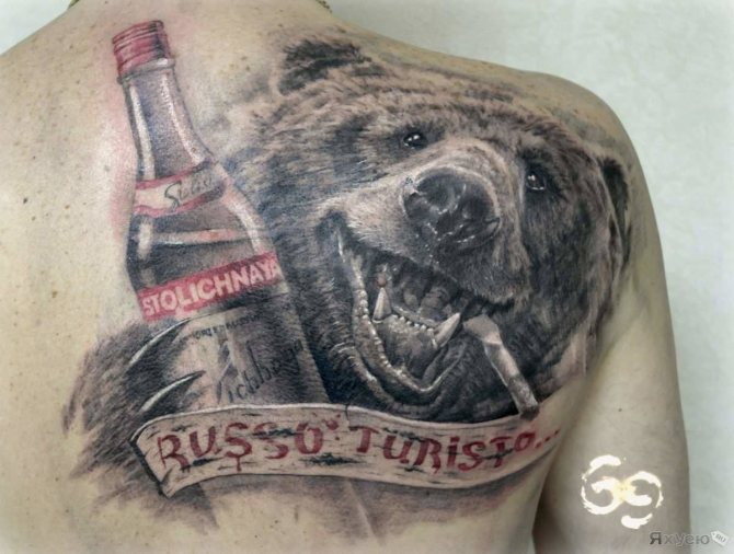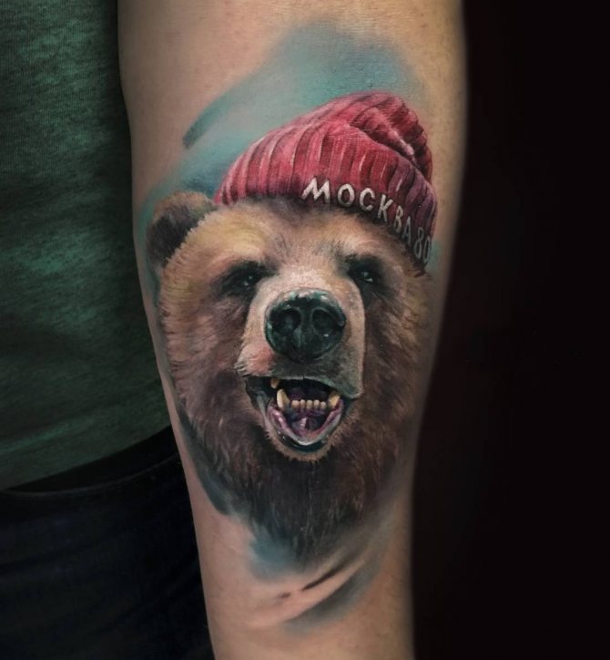- In Russia, the bear is the embodiment of the "Russian spirit" itself. The appearance of calmness and sluggishness in appearance is a deception, instantly changing to aggression depending on the situation. By demonstrating the grin and rising to his full height, the bear immediately shows who is the master of the situation. A tattoo with a bear grin, in Russia, denotes male courage.