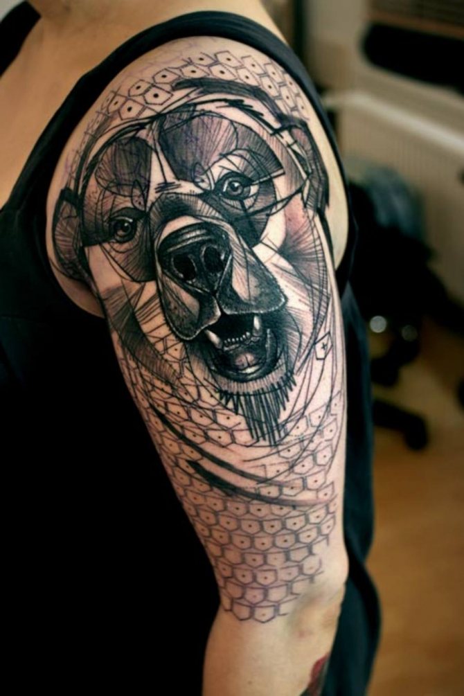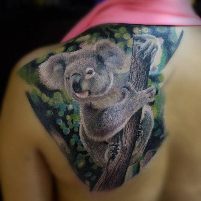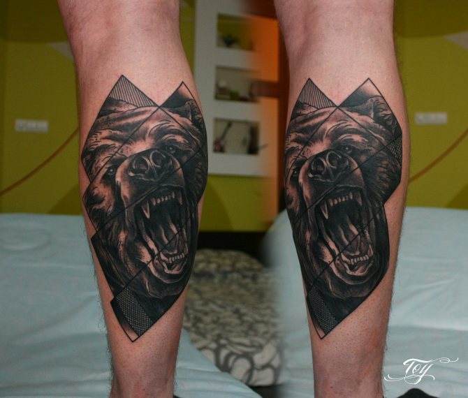 On the male body effectively look bears in a realistic, Celtic or Polynesian style with the addition of woven elements, abstractions with broken or rounded lines. The most successful location of such a tattoo is on the shoulders, back, chest and forearm.