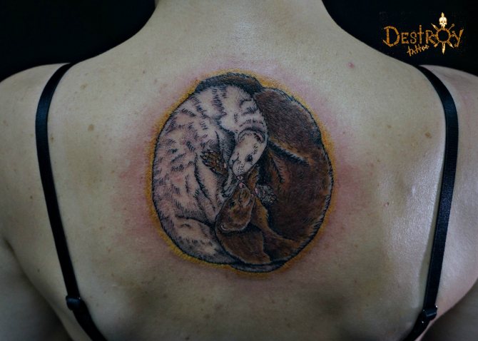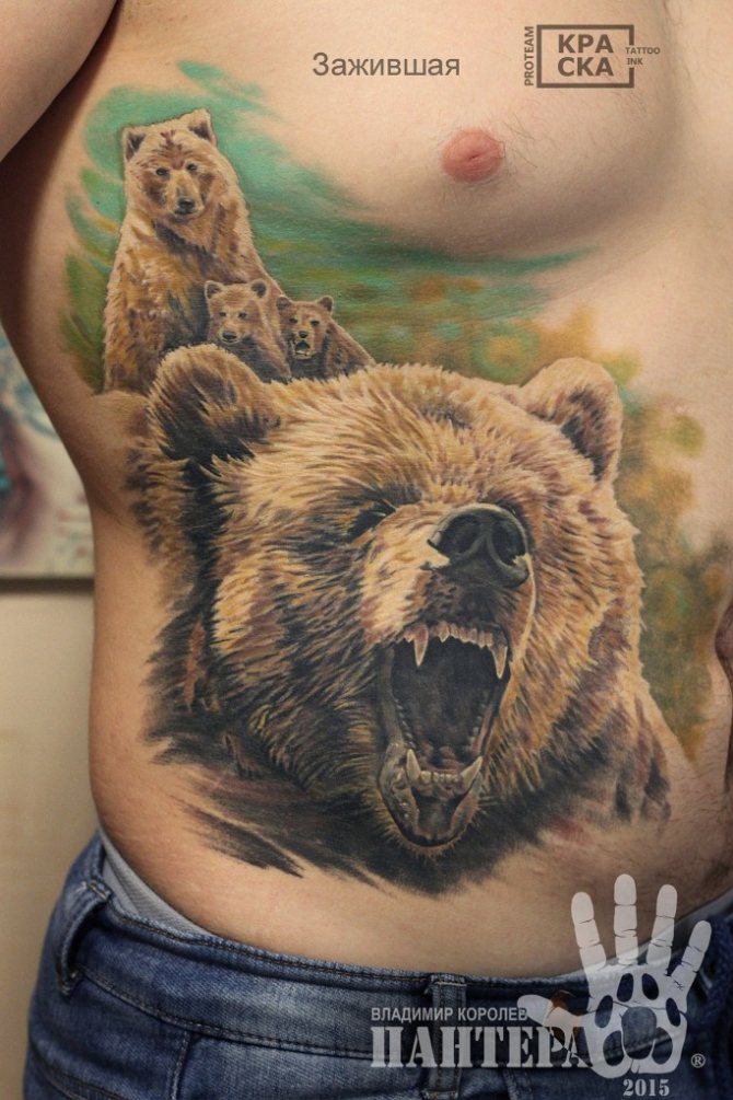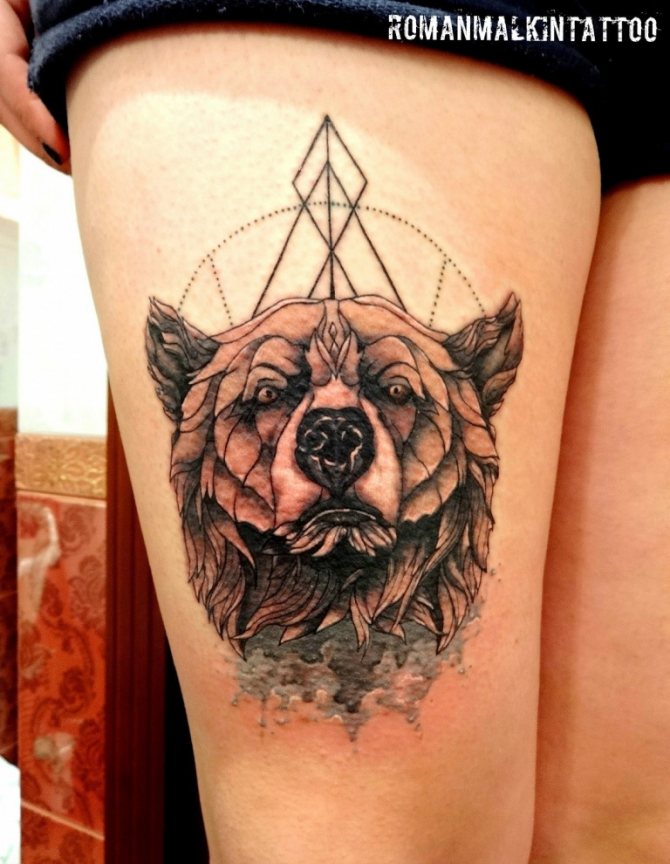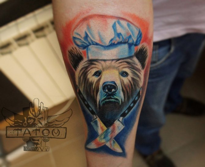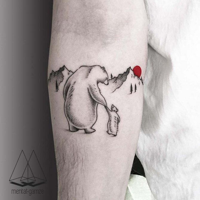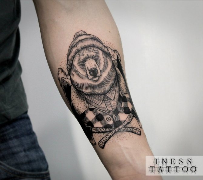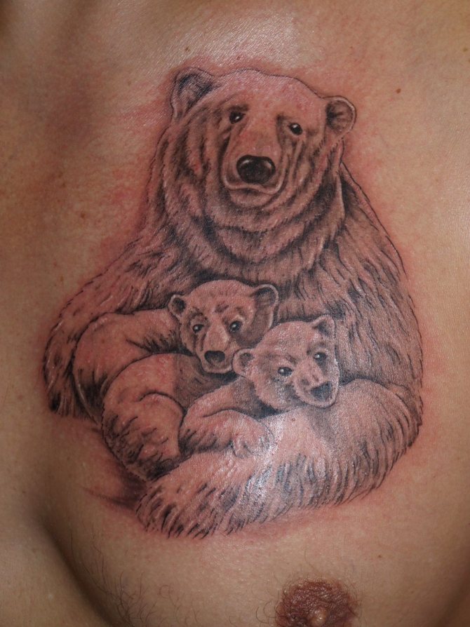 Tattoos with bears are popular among men, often inscribed on the shoulder or chest. Among the most popular designs in men, the bear with the grin, the bear's paw. In women, although such tattoos are rare, this image of a bear with cubs is a symbol of motherhood.