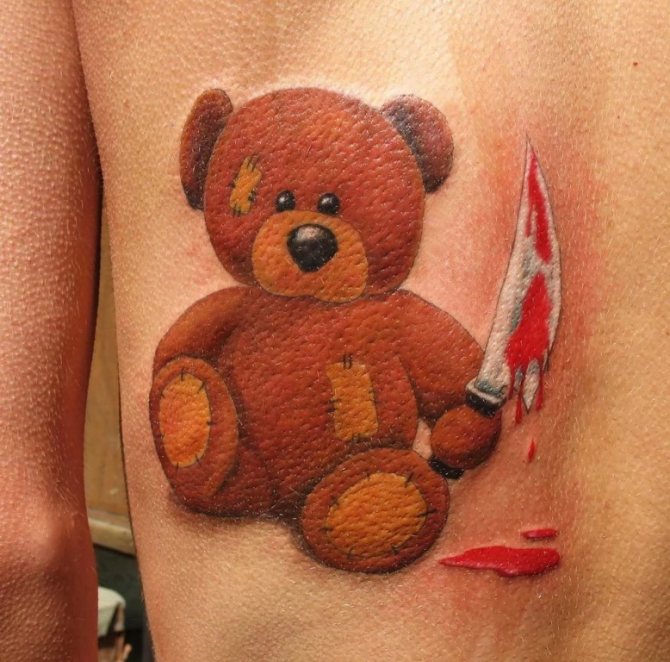 Notes of playfulness give tattoos with a teddy bear with a flower in his hand. Especially beautiful such an image looks on the lower back.