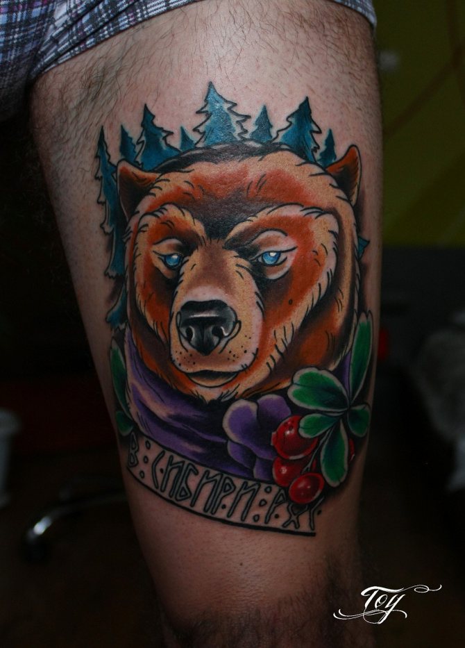 Tattoo with a brown bear means wisdom and inner strength, the unwillingness to conflict. It is a traditional Russian symbol associated with courage, luck and greatness. The symbol patronizes warriors, hunters, gives them courage and bravery. Athletes often use a tattoo of the Olympic bear, which was the symbol of the 1980 Olympics.