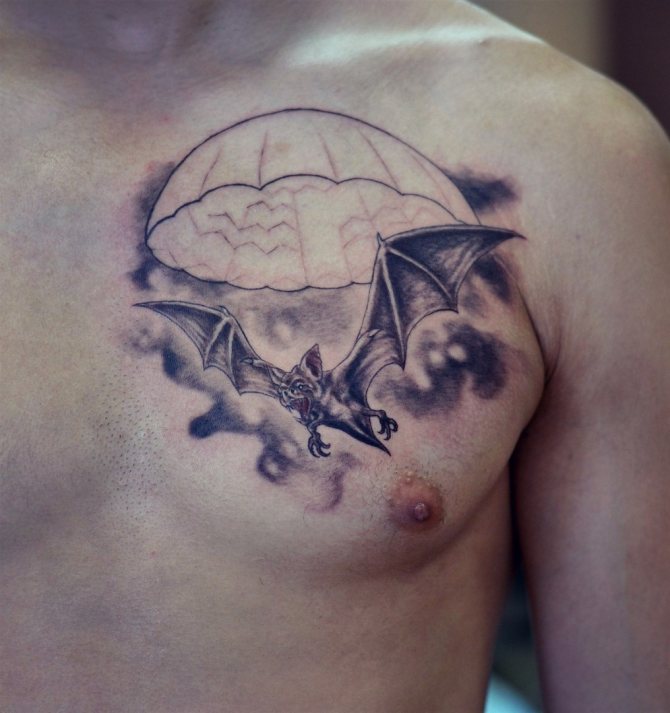 A bat is a distinctive insignia of people who served in the military agency's directorate. Tattoos made during military service are a symbol of time lived and experience gained in military operations. At the sight of such a mammal tattoo, every intelligence fighter can easily identify his colleague and recall past years of service.