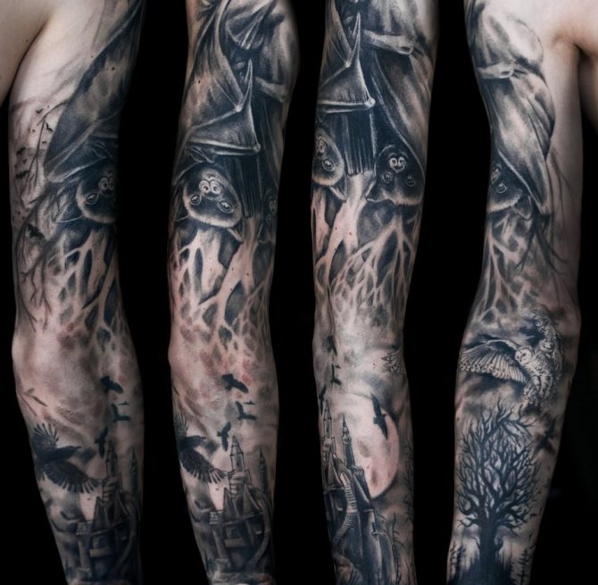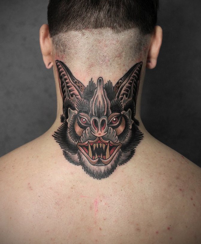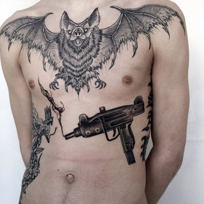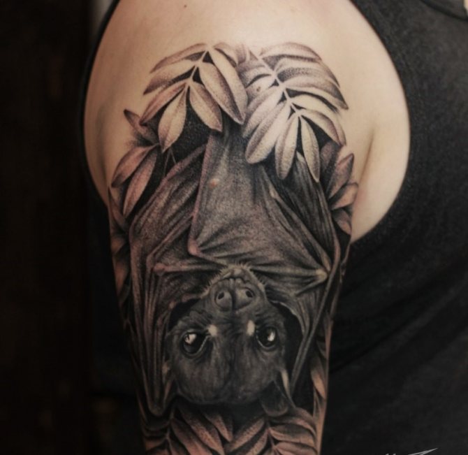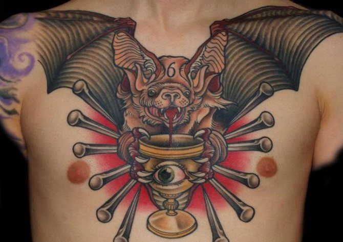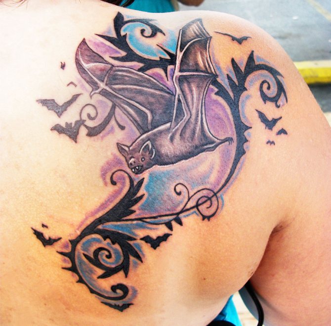 If the guy is in no way connected with intelligence, this is not a problem, as modern tattoos have no restrictions and can be used by anyone. Often the male bat tattoo has an aggressive appearance, with the animal depicted with a grin, thus emphasizing the aggressive and rugged male character, the guy's ability to stand up for himself and his honor. The tattoo has a special role for people associated with medicine. As studies have shown, the saliva of vampire mice contains an enzyme that helps to treat pathologies of the cardiovascular system, so the tattoo of a bat on the back may symbolize the protection of the heart and blood vessels.