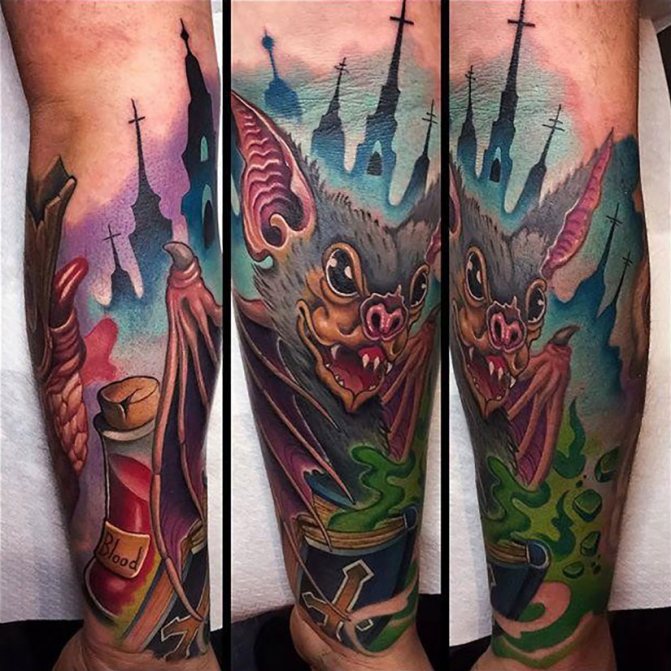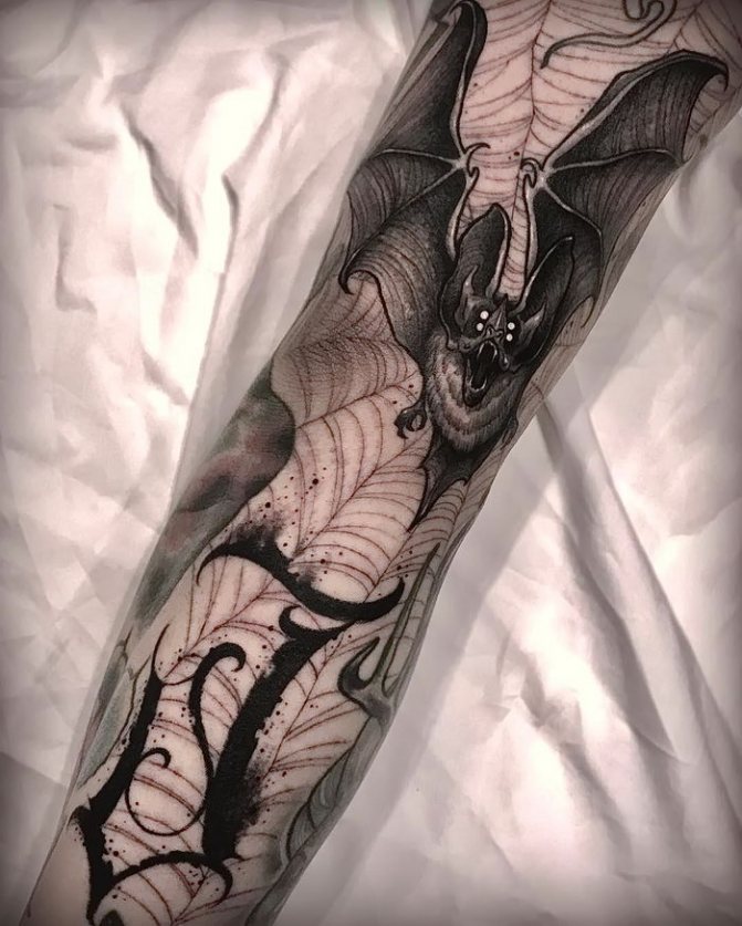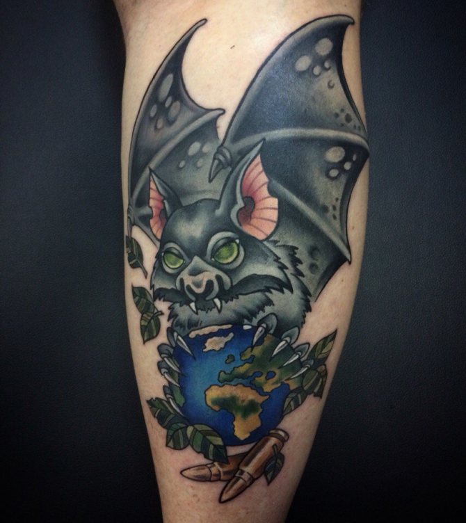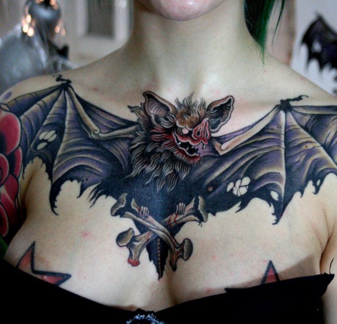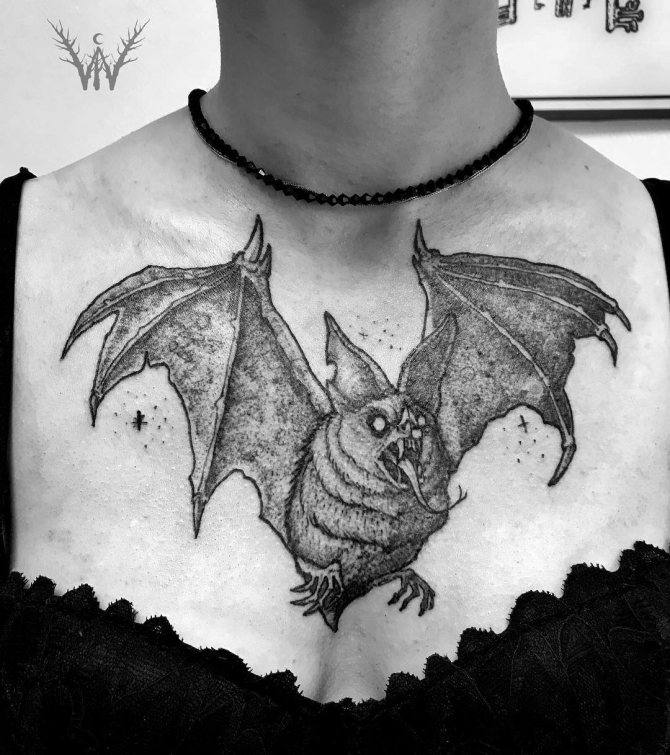 Probably since school, everyone knows that the bat is a nocturnal inhabitant, which is predatory. In this regard, the first meaning of a bat tattoo is danger, evil and death. Many believed that its image is found in magicians and sorcerers, as well as personified with the help of its images of vampires and werewolves, which are the generation of darkness. There is also a special kind of this animal, the vampire bat, which hunts at night, feeds on the blood of warm-blooded animals, and in some cases can even attack humans. Because of this, people have always hated and were terribly afraid of these mammals, because their mere appearance brings fear and terror.
