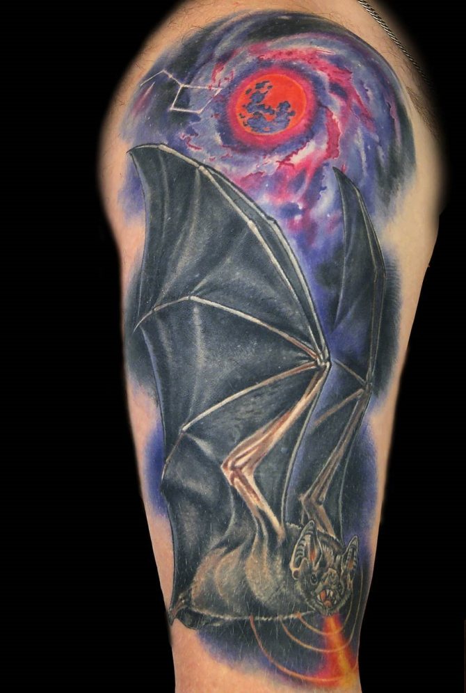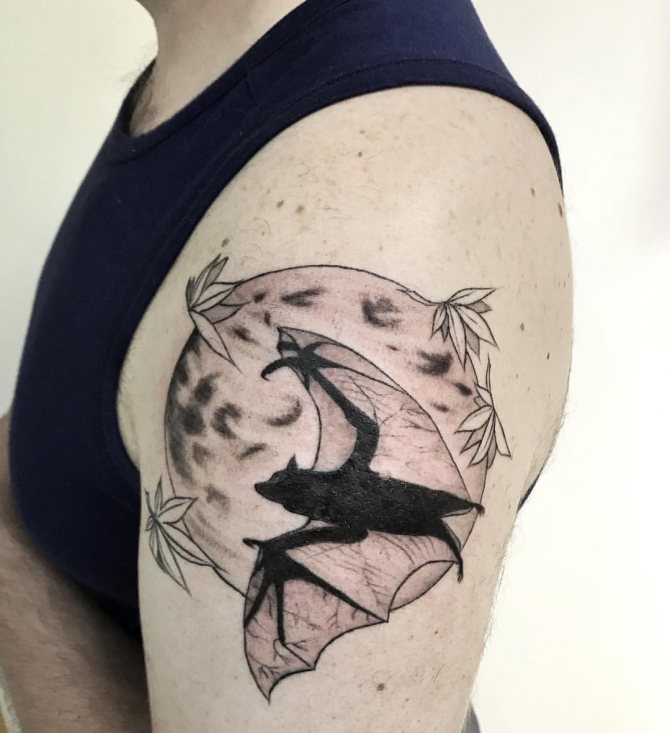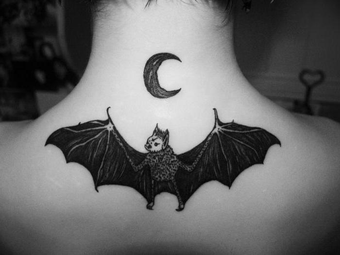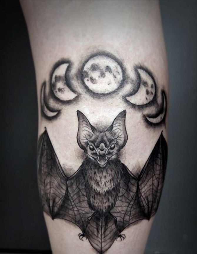 Tattoo with the image of a bat is considered a universal symbol, so it can be used, both by girls and men. However, among the representatives of the stronger sex - this picture is in much greater demand. For example, it can tell that its owner served in intelligence. Also, the bat is a symbol of courage, stealth and invulnerability for men. At the same time, the sketch contains the bat on a dark background, complemented by the moon.