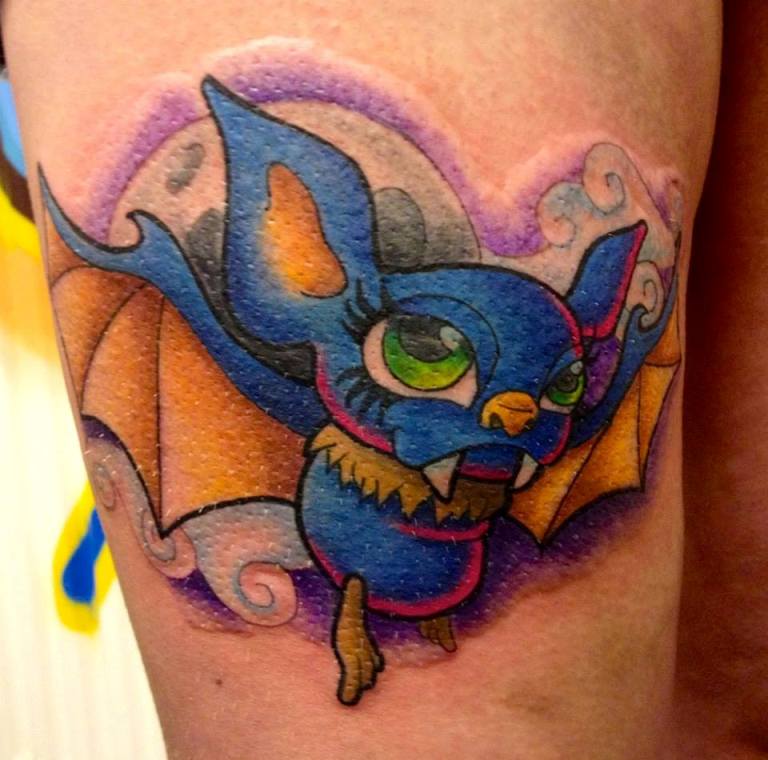 - Oriental - in this style the bat tattoo has only positive meaning, because the winged predator in the East is considered a symbol of good luck and fertility. To create a sketch, you should give preference to fine lines and bright colors.