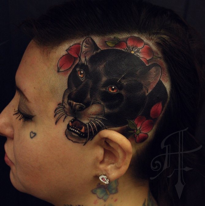 Tattoo with a panther in any area of the body will symbolize very many qualities, but the most basic ones are power, power over people, cunning, power and, of course, purposefulness. Tattoo with the image of a panther most often found on a beautiful female body, as this animal is considered the unsurpassed mother, who will protect her family at absolutely any cost. Women prefer to depict the predator on the arm, hip, shoulder. Particularly adventurous persons apply a tattoo with a panther even on the head. But for men, too, the panther tattoo is no exception. It all depends on the style of execution and the elements present on the tattoo. Many want to put a nudge with a panther on the area where the most muscles, to emphasize the beauty and strength.