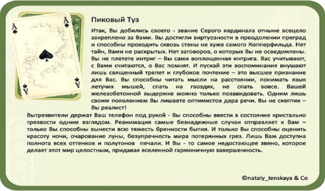 The person to whom the ace of spades falls can be called predisposed to success. In this case, having achieved success, the person may well withdraw from business and allow others to use the results of his achievements. He may not give up his rights (such as copyright), but he will give access to information to other people.