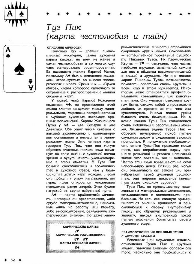 In work-related divination or divination games, the ace of spades reveals such abilities as stubbornness, willpower and determination. The questioner strives to thoroughly understand his or her area of expertise, to get to the heart of the task at hand. Sometimes it indicates a closed nature and a desire to work alone.