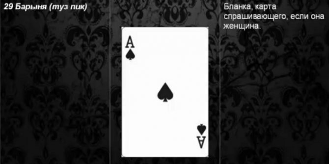 The ace of spades is one of the most dangerous cards in the deck, and it almost always symbolizes blows of fate and trouble. Fright, disappointment, illness, death can await the diviner in the path of life.