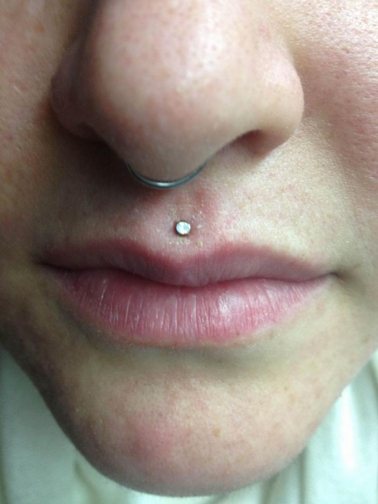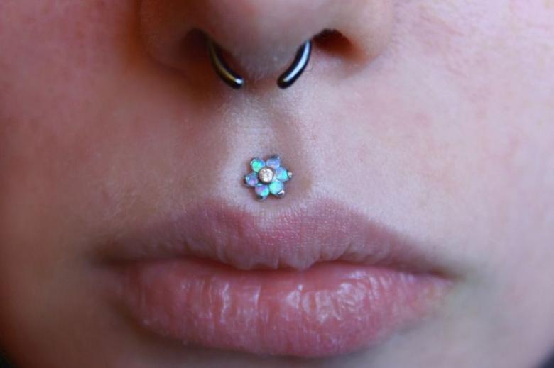 Piercing "jellyfish" - this is one of the most popular types of decorative piercings on the face. The hole and decoration is installed in the depression between the upper lip and the nasal septum. Typically, titanium, steel, Teflon, and less commonly, silver or gold labrets are used as jewelry, with only a balloon visible in the cavity. It looks very attractive and, as a rule, "jellyfish" is made by young girls who wish to attract the attention of the opposite sex to beautiful plump lips (as on the photo). Often, in parallel with the jellyfish, a piercing of the lower lip is made, in which a labret with a decorative ball is placed in the hollow between the chin and the lower lip. Symmetrical jewelry looks spectacular.