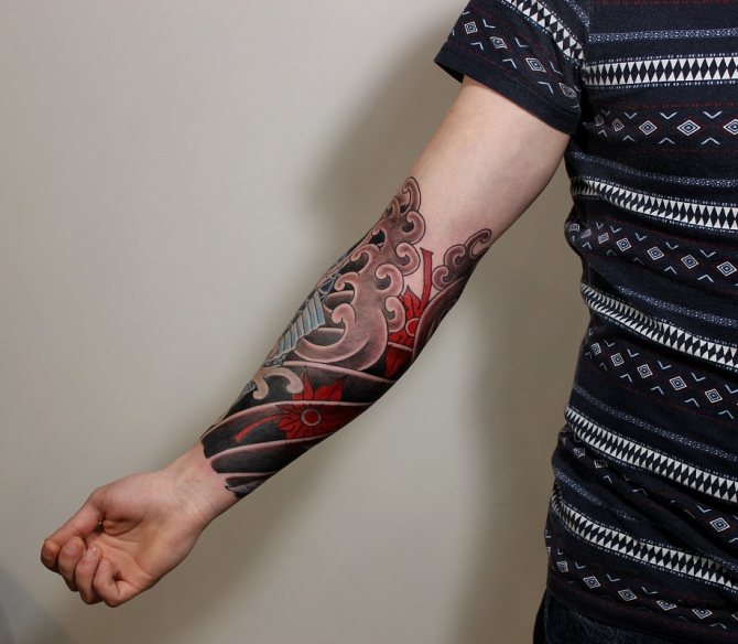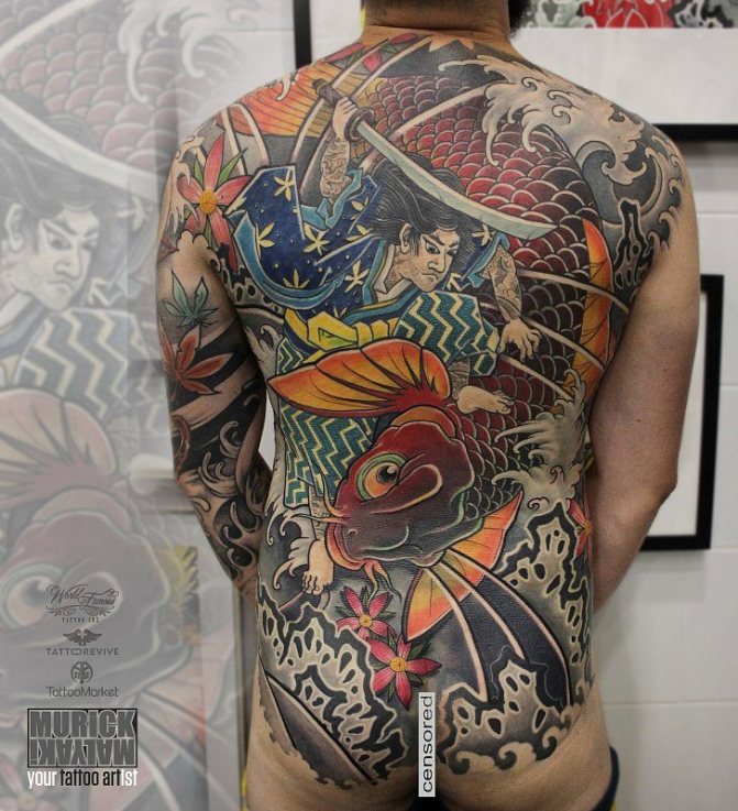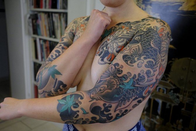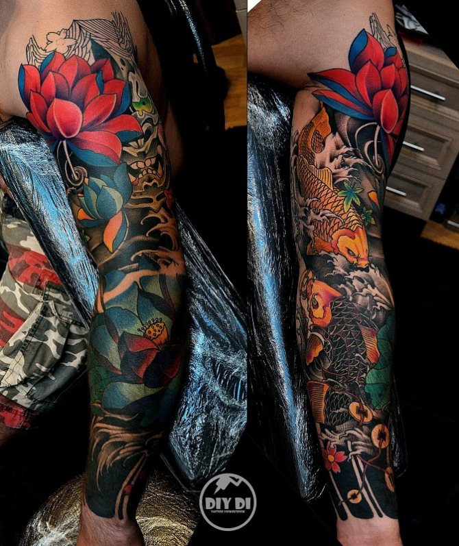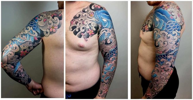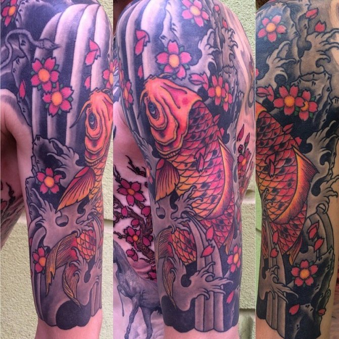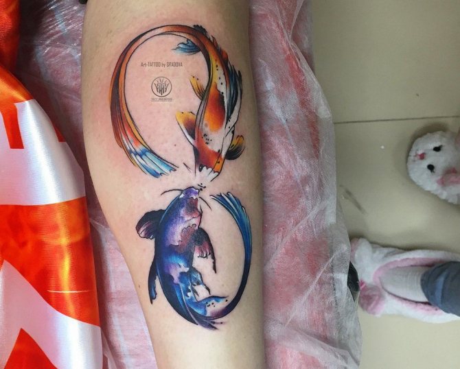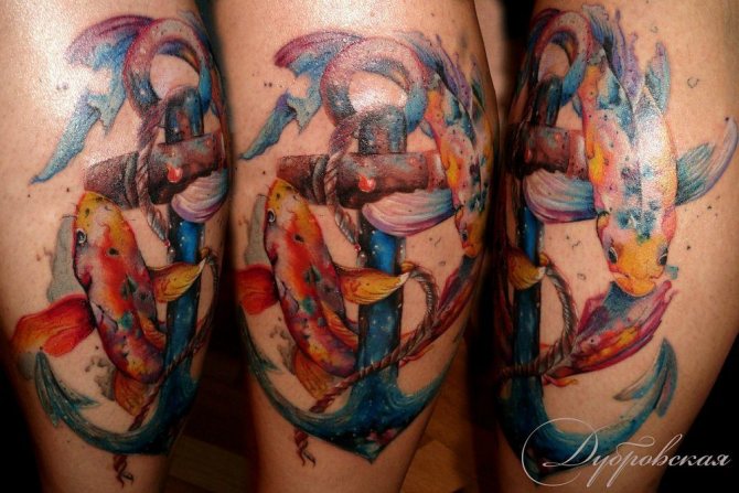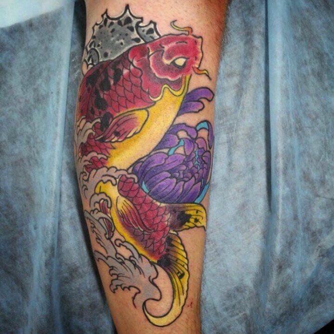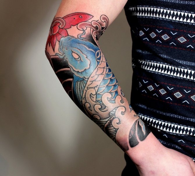 The meaning of a tattoo in this style is quite complex. For some, it is a symbol of peace and quiet, while others see the fish as the riot of the sea and water. They are all right in their own way.