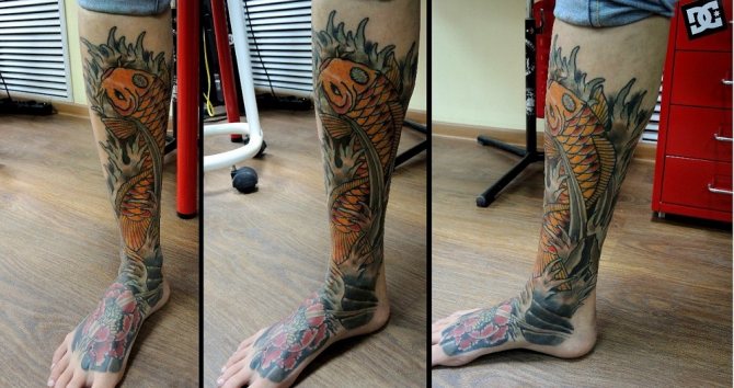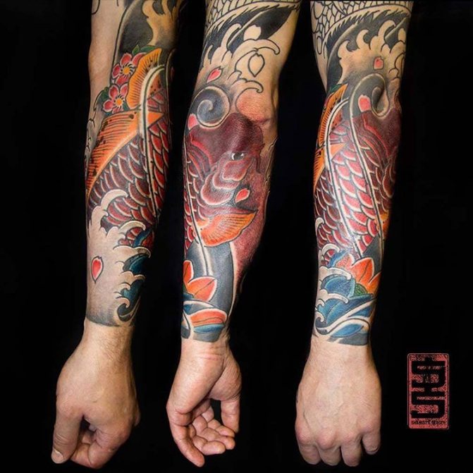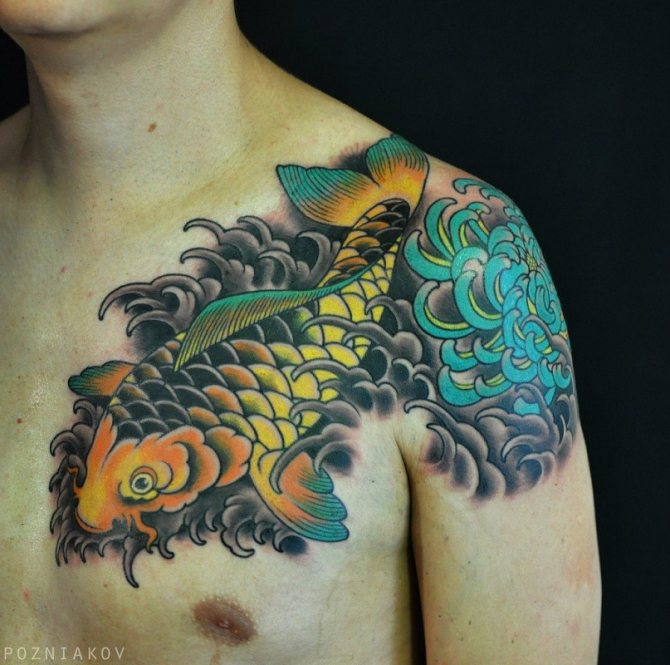 The meaning of the carp tattoo in the East has a positive meaning - for example, the Japanese are very supportive of the fish, as it is considered a symbol of longevity, prosperity, purposefulness. The fact that the carp is able to overcome impressive distances, even in a rough current. This is why in Japan and China it is considered to be an embodiment of masculinity - creative, purposeful and persistent.