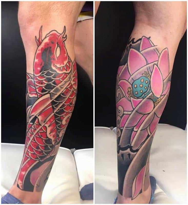 With its rich cultural history, the koi carp tattoo is characterized by many associations and symbolic meanings. The main meaning is associated with the fish's ability to overcome the current and climb up waterfalls, which speaks of the courage and perseverance of this creature. Since the koi carp tattoo has Japanese roots, the interpretation of the sketch largely depends on the choice of color performance. A white koi, Kohaku, means success in your career. The combination of white and red color symbolizes courage, energy, represents love and readiness of the owner for a long relationship. Kumonryu, a black-colored fish, will tell about life changes and transformations. The silver-colored carp, or Obon, demonstrates the success of the owner. Golden koi - Yamabuki, symbolizes prosperity and wealth. A drawing with two fish is the guardian of a strong, happy and long-lasting marriage. A sketch in which a koi carp is depicted with the head of a dragon is considered a powerful amulet that can protect the owner from problems and misfortune.