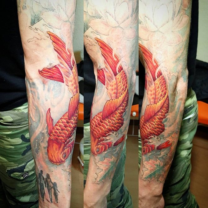The meaning of the tattoo sketch with the image of a carp depends largely on the theme of the sketch and its additions. Drawings, designed in the Eastern style, are interpreted only with positive meanings. The Japanese see the carp and its image as a symbol of longevity and prosperity. The Chinese revere this creature as a powerful, wise leader and place it at the head of all fish.