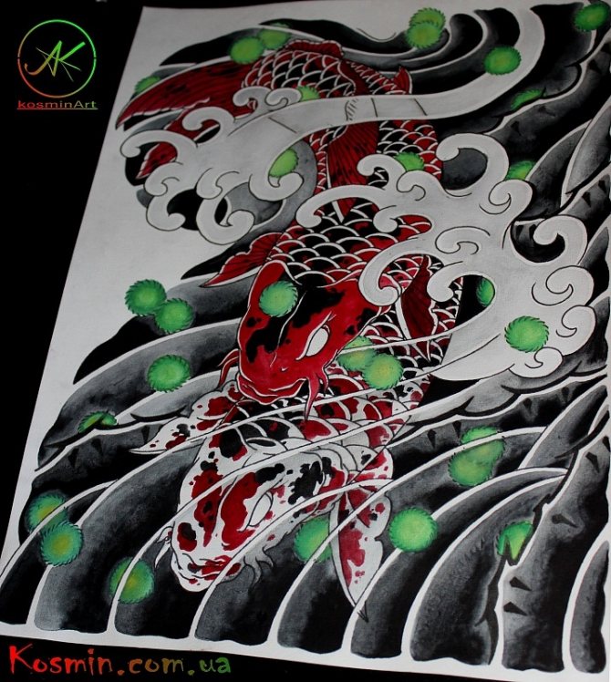 Also, very often the fish is complemented by floral elements in the form of lotus leaves and flowers, water lily, peony buds or sakura branches. Sketches can be colorful, monochrome or decorated in the transition of one color from a darker shade to a lighter one.