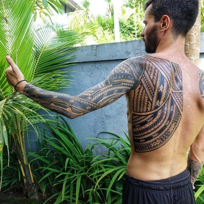 Sometimes Samoan tattoos are chosen by both men and women. Such natal images are most often made in the style of old-school and graphics. Such tattoos are often applied to the back and chest. Sometimes an arm or leg acts as such a place of application.