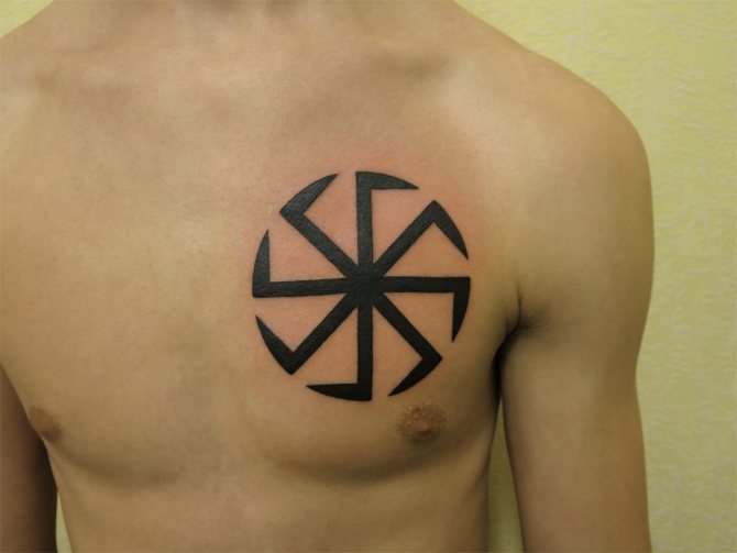 One of the most common tattoos on ancient Slavic themes were Slavic swastikas of different angularity and shapes. This ornament is often confused with the swastika of Nazi Germany, which also borrowed from ancient peoples, so there is no need to compare such things. The tattoo of the Slavic themes is depicted as a cult sign of the cross with bent clockwise ends, denoting changes subject to the laws of nature, changes in the environment - the alternation of night and day, the seasons.