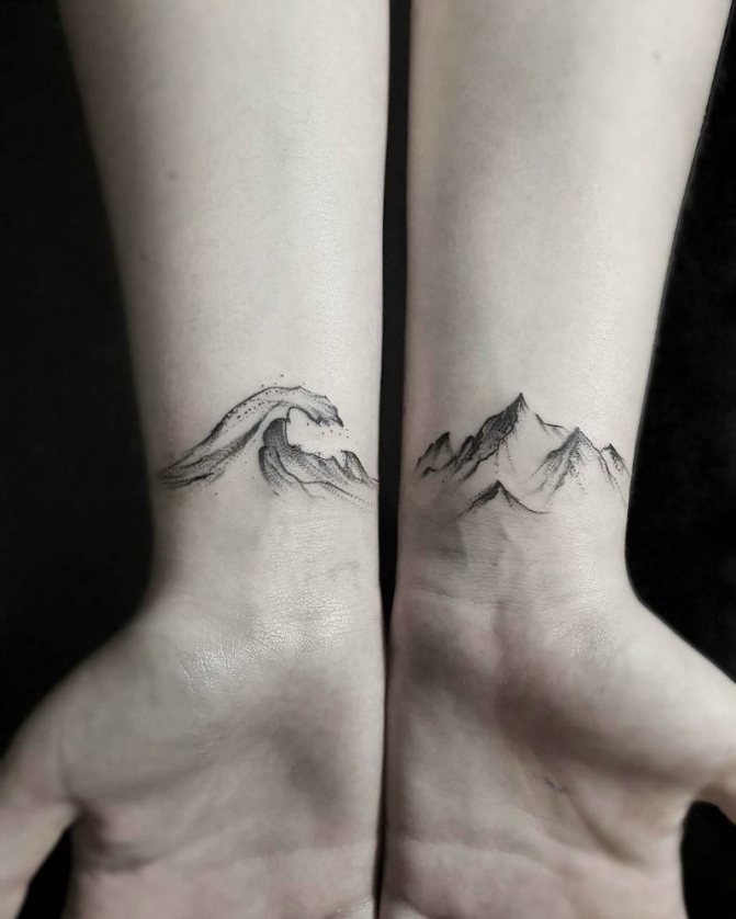 Often the mountains are complemented by other images. This can be animals or birds, but the choice should always be made with the utmost care. Also appropriate would be waves, a month or dense trees. It all depends on what meaning you plan to put into your tattoo.