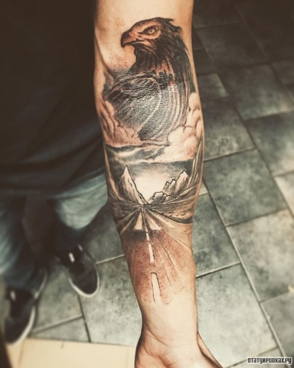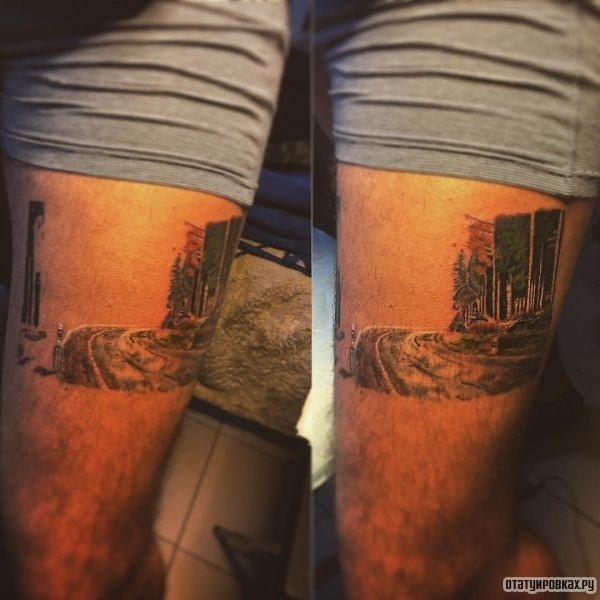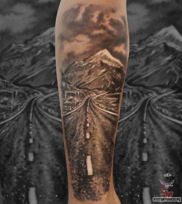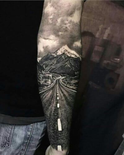 Most often, the road is depicted in a realistic manner and in black and white. Of course, the color image will also look very impressive. It is important to allocate a large area of skin for a tattoo and to find a good tattoo master with a lot of experience. Often the road is depicted in the background of a beautiful landscape. You can choose the idea in our catalog of tattoos with nature.