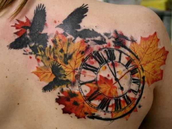 The clock tattoo is the image chosen by both men and women. No matter what image of the clock is chosen - a stylized or extremely realistic, the philosophical meaning of this tattoo does not change. Sketches of the clock tattoo are performed in a variety of styles and are applied most often on the arm, shoulder, back or chest.