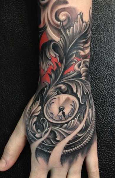 The image of a complex clock mechanism, a combination of many small details - a symbol that the person with such a tattoo on his body meets the circumstances in life. In which he is ready to understand and adjust them in his own way.