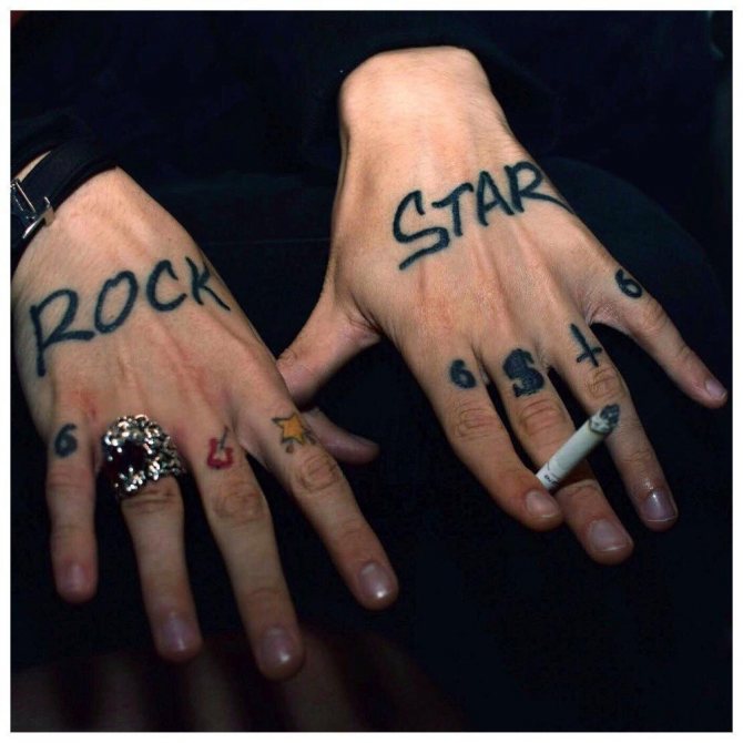 On the hands and fingers they draw either rapper tattoos on the knuckles (usually their pseudonyms), or simple minimalistic words: life, love, family.