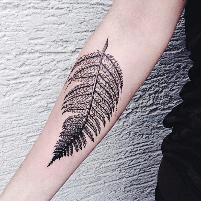 Accordingly, the chosen image and will depend on its place of application. For example, a small twig or a leaf curled up like a swollen bud would be ideal for the neck, back, side, shoulder blade, neck or forearm. An image of the mythical fern flower is better to place on your chest, back, shoulder or wrist. By the way, it is on the hand most often this beautifully shaped leaf depicted by the fair sex. And on the chest and back - men.