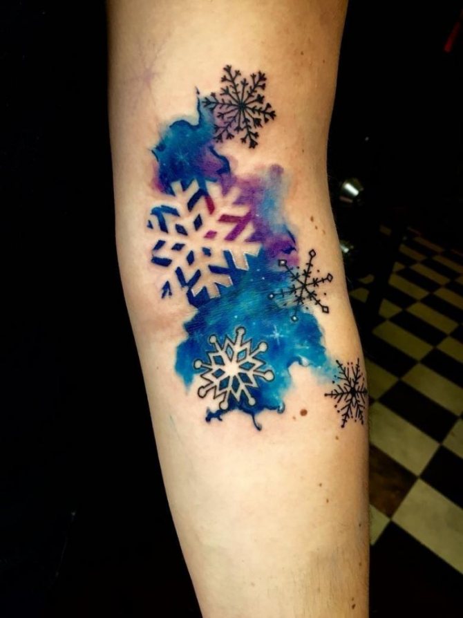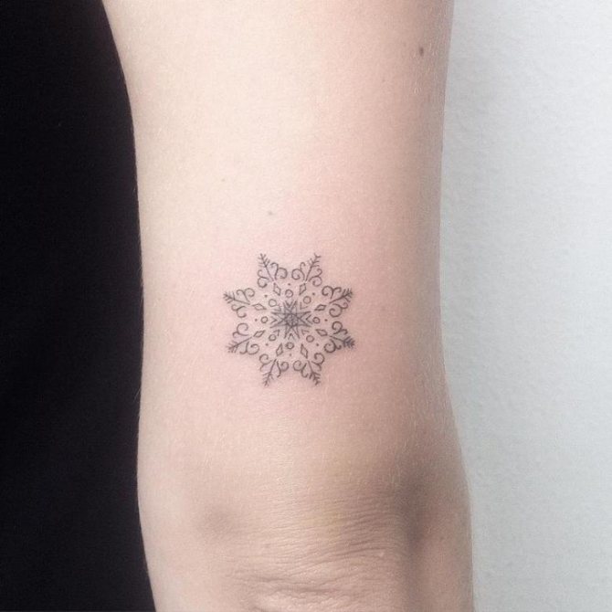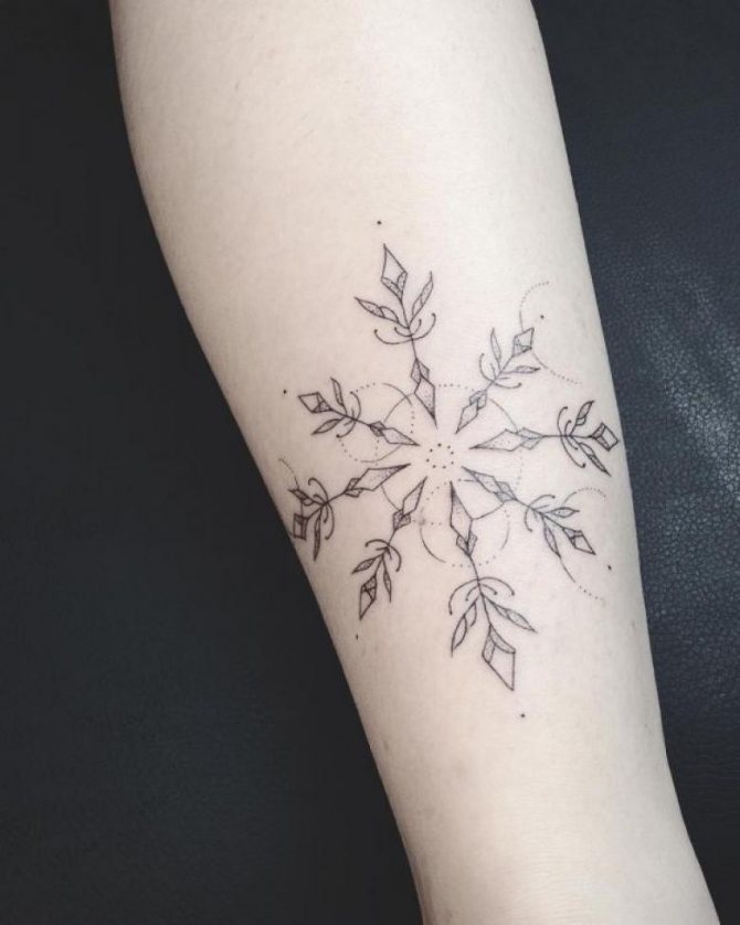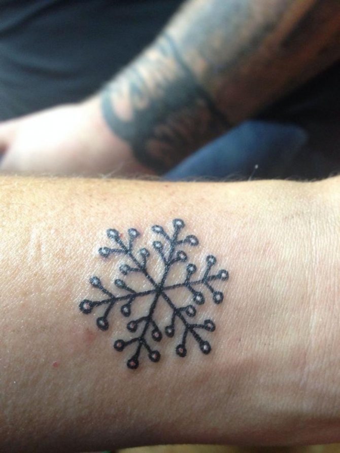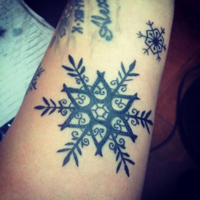The snowflake tattoo is very much in demand by people who believe in the magical power of runes, as on a par with the sun, the snowflake is a solar sign. The symbol of the sun, the snowflake and the polar symbol. These are creative, talented and dreamy people, poised and non-conflicted, gentle and tactful. The meaning of the snowflake tattoo can be interpreted as the extreme vulnerability and resentfulness of man. Sometimes it is a way to express the desire to find his protector and helper in life. It is very rare to meet people who, with the help of such a tattoo trying to demonstrate his loneliness cold and unapproachable appearance.