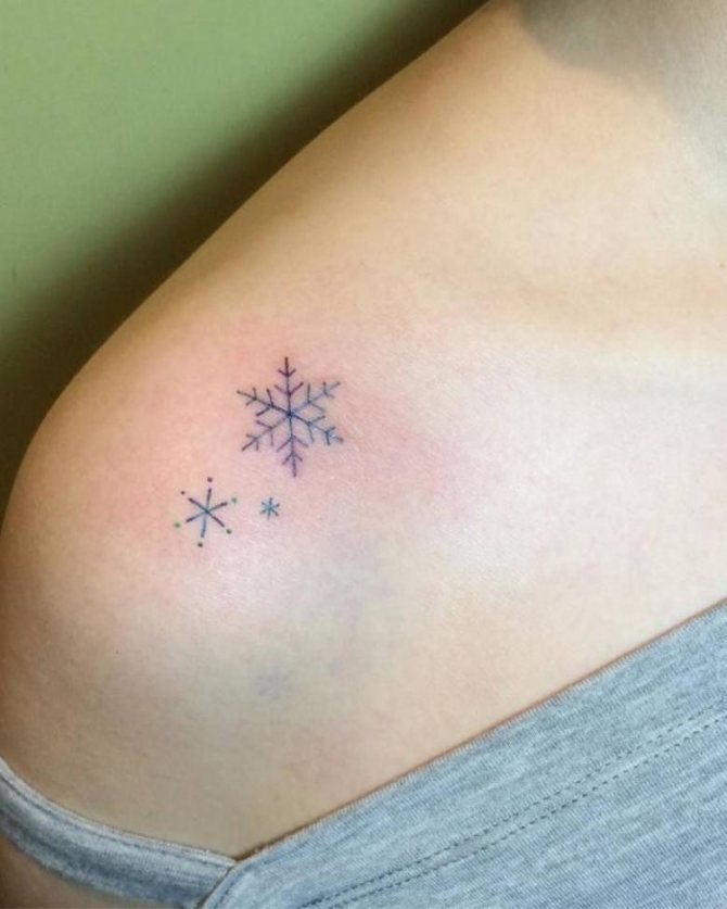 Weakness and fragility is embodied by a small snowflake, which girls choose to decorate their fingers, wrists, feet. Performed in shades of blue and blue, the image denotes purity and innocence, because the white color of freshly fallen snow in many cultures is associated with chastity, freshness. These tattoos are chosen by girls who are modest and quiet, attracting attention not because of their bright appearance, but because of their intelligence, caring and self-esteem. The image of a snowflake is a hidden desire to find a protector, a strong and wise patron.