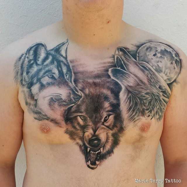 Tattoos for men "wolf" on the chest are depicted in different interpretations. Most often the wolf has a fiery look or additional elements drawn, which should influence the magical actions of the sign.