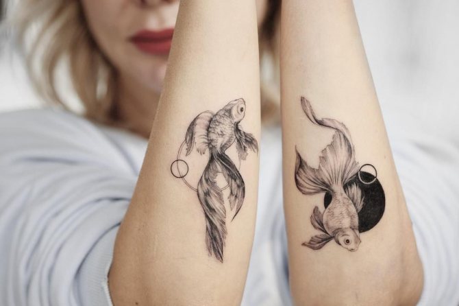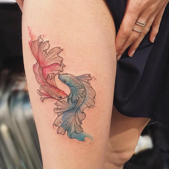 Tattoo Pisces is often represented in the form of two fish swimming in different directions. This sketch has a deep meaning, gives out in its owner a versatile personality, which is always in harmony.