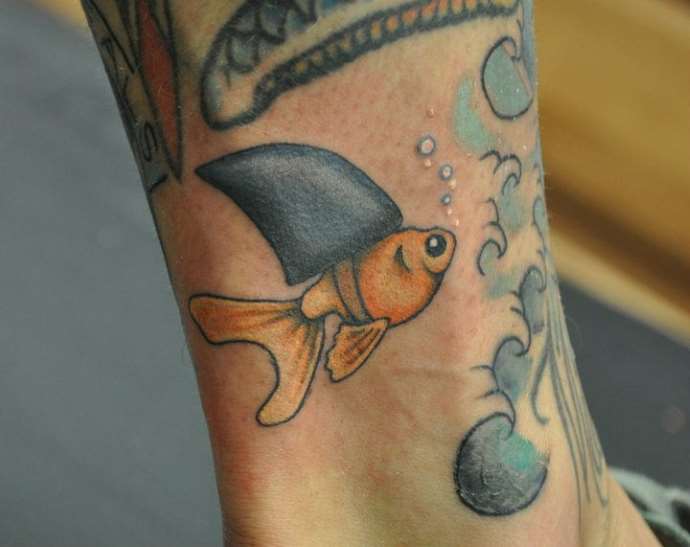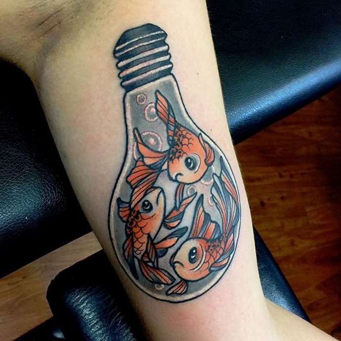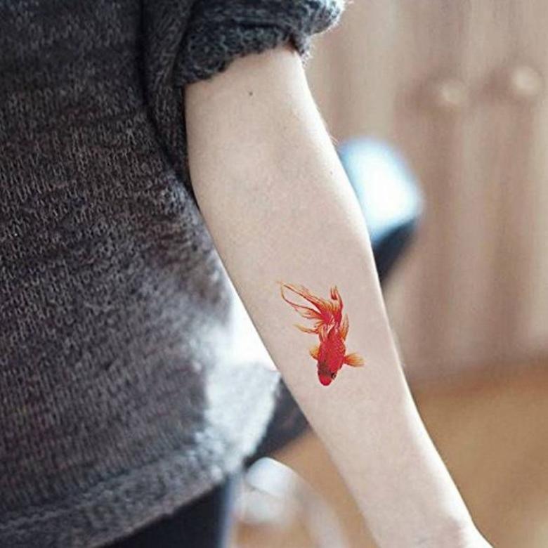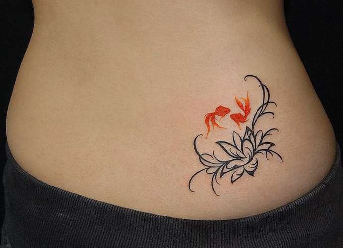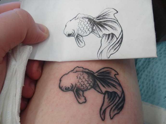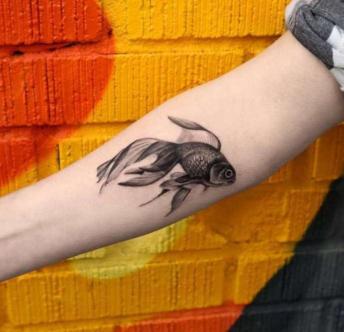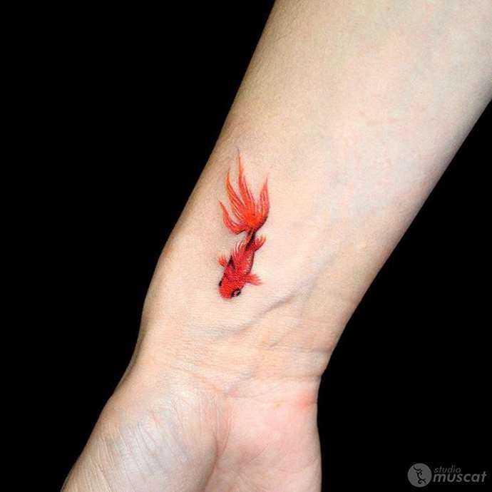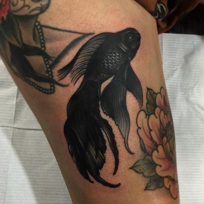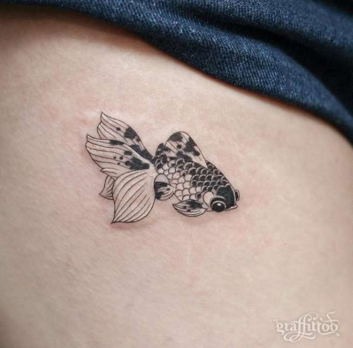 Goldfish tattoo refers to the universal, but it is more popular among the fair sex. Men often invest in this image meaning to attract good luck and financial well-being, and for girls, such a tattoo symbolizes fragility, softness and femininity.