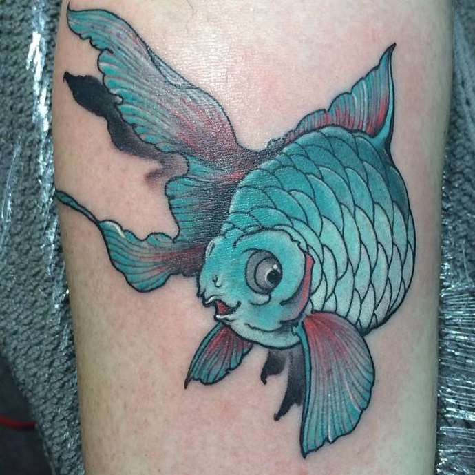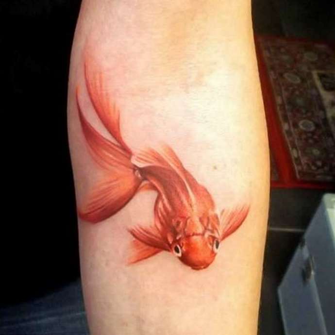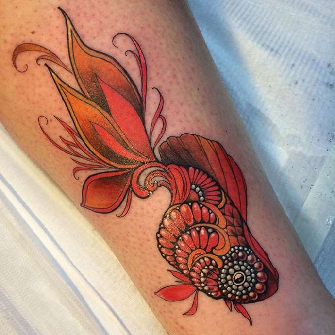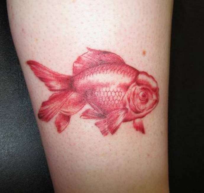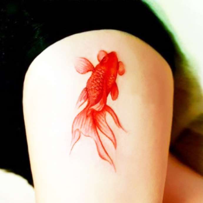 For the goldfish tattoo sketches are usually chosen in gold, yellow, red shades. Saturated bright colors make the drawing a real work of art. For the image of animals usually use the style of realism, but it is better to choose for the goldfish tattoo watercolor: this style looks more effective. Such a drawing is characterized by lightness, airiness, smoothness of lines and blurred contours.