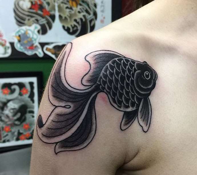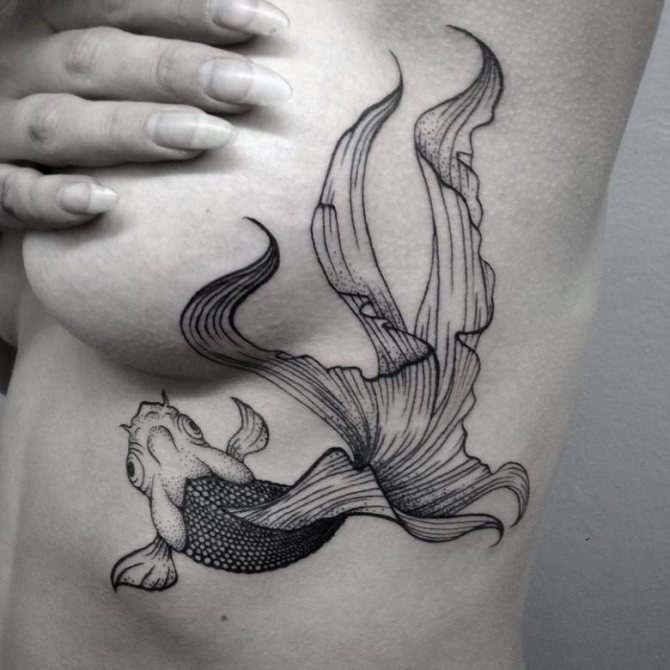 You can consider a monochrome version in the Dotwork style. The tattoo is applied with a lot of small dots exclusively in black ink. Interesting sketches with goldfish, photos of works in large quantities are presented in the gallery.