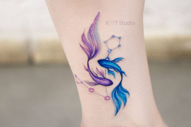 Esotericists advise to do a tattoo of the 12th zodiac sign in the colors of water, such as purple, blue or turquoise. In addition, soft orange, yellow or scarlet are also welcome. The astronomical depiction of the constellation is done in black, sometimes with the addition of red elements. Also the constellation lines are complemented with various details.