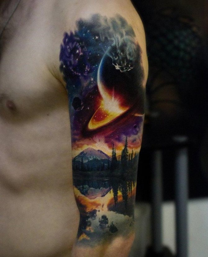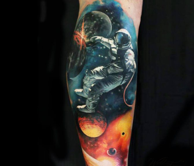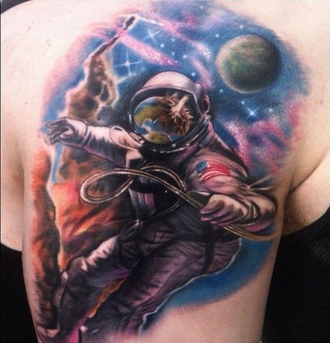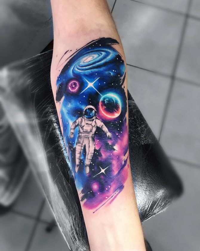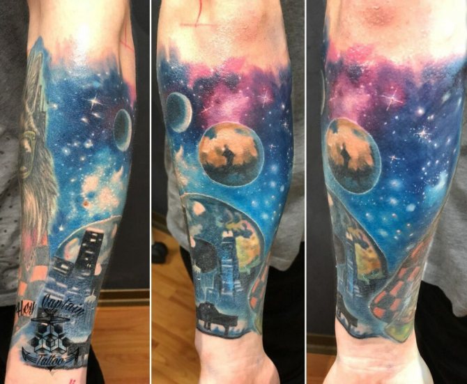 Among all the variety of tattoos, the image of space has become popular quite recently. If to believe statistics of experts on creation of tattoos, planets, stars and colored stretches of space began to be in demand only 5-7 years ago. Before popularity enjoyed only certain space attributes, such as rockets, constellations, the sun or the planets. Now it's a real work of art, capable of attracting its beauty and originality.